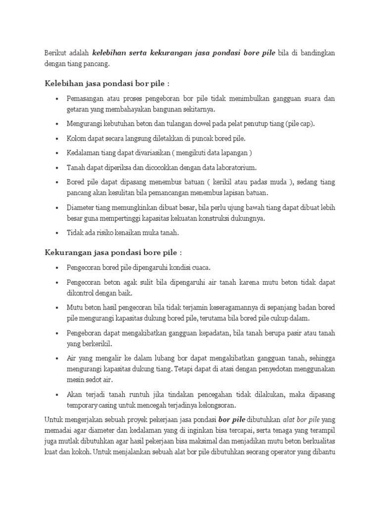 Pada dikala keadaan cuaca di zona konstruksi. Kelebihan Pondasi Bore Pile. Kelebihan dan Kekurangan Pondasi Bored Pile.